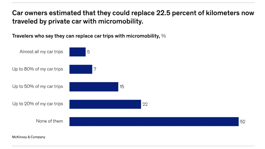 In its McKinsey global 2022 ACES consumer survey, McKinsey found that car owners estimated that they could replace up to 22.5% of kilometres they travel by car with some type of micromobility. This includes bicycles, e-kickscooters, and mopeds amongst others.
