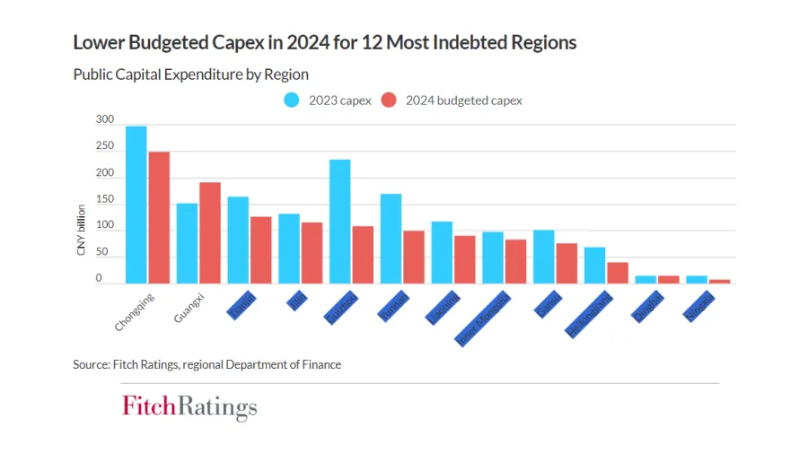 “Our analysis of the 2024 budgets at these 12 regions shows a consistent trend. Their planned capex for 2024 will decline by 23% from 2023, with Guizhou, Ningxia, Heilongjiang, and Yunnan provinces projecting the largest reductions in spending,” Fitch Ratings noted.