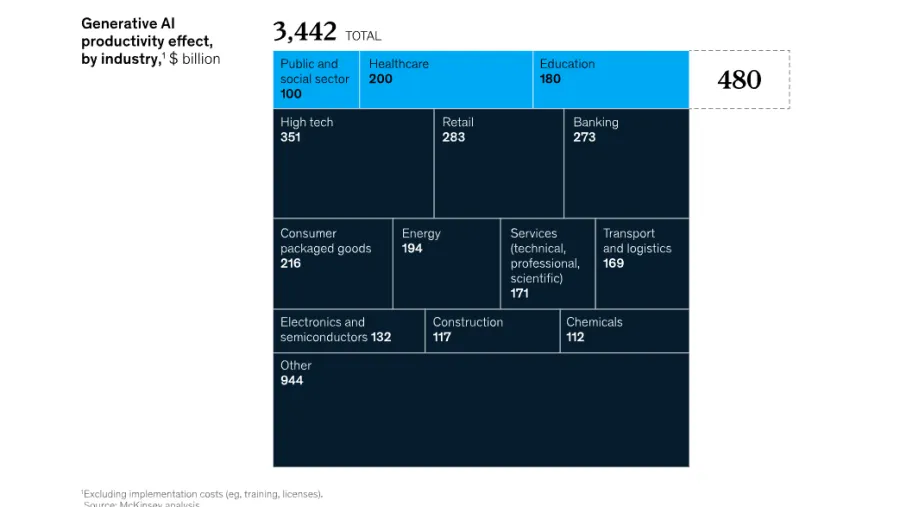 In the public and social sectors alone, generative AI could have a productivity effect worth $100b, while its productivity impact in the healthcare and education sectors is worth $200b, and $180b, respectively.