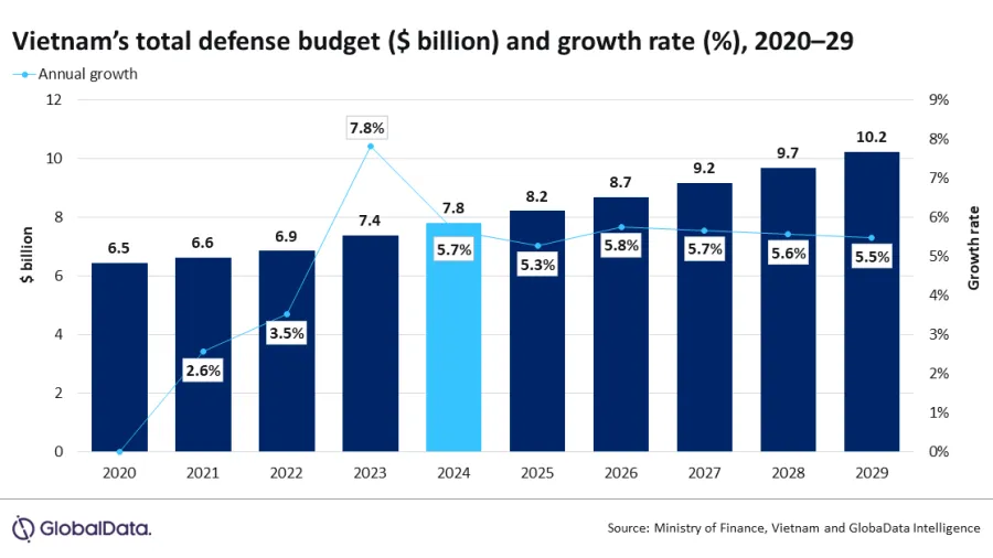 Vietnam’s defence budget will increase to an estimated $10.2b by 2029, GlobaData reported.